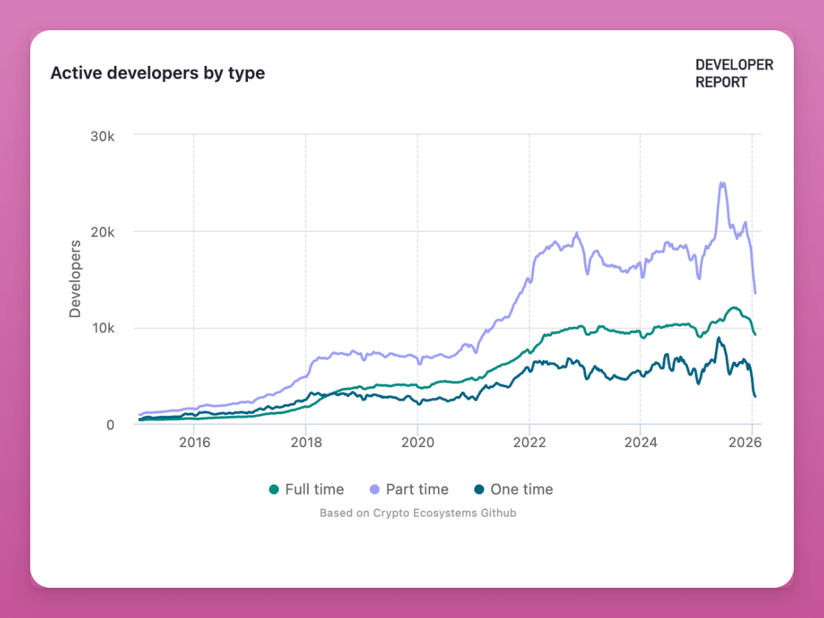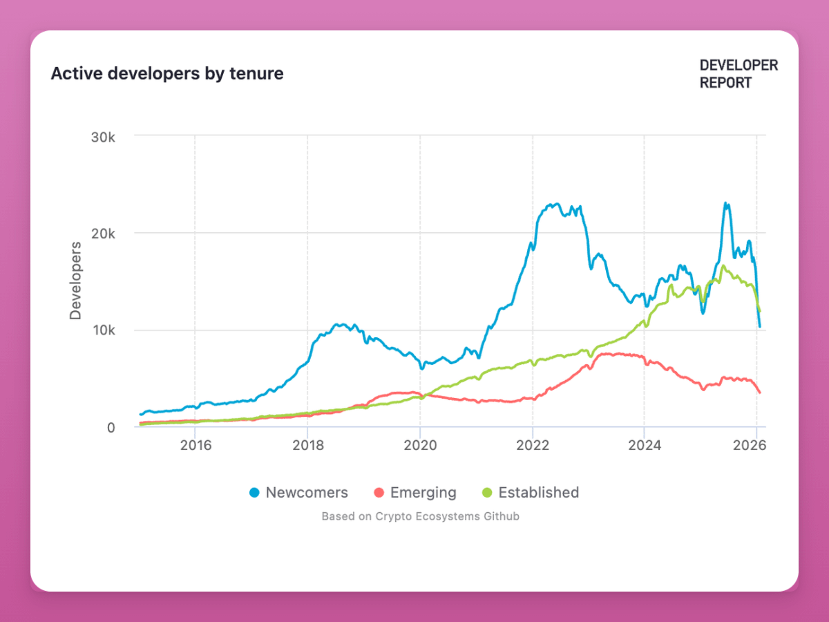 The decline is mostly part timers and newcomers leaving. The 2024-2025 cycle brought a wave of devs chasing easy money with airdrops and token incentives. When those dried up they left.