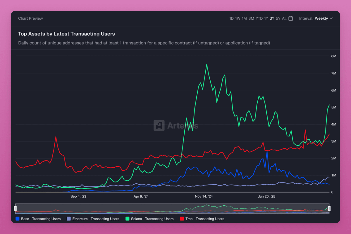 Solana is finally having a revival of active addresses, Ethereum is picking up too (thanks to scaling hardforks!), and Tron’s users never actually left.