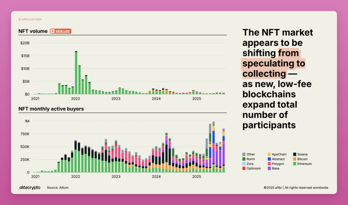 Although this a16z report states that growth is due to “collecting” I believe all the uptick in buyers come from Zora-style posts that convert X-style posts into financially traded NFTs.